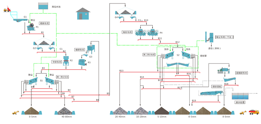 自動控制,實時監(jiān)控,提高工效。生產(chǎn)線基本工作原理為:物料集中送進(jìn)料倉,經(jīng)過破碎制砂設(shè)備依次進(jìn)行三重等級破碎,期間通過輸送機(jī)連接到振動篩,并通過振動篩篩分出不同規(guī)格的石料產(chǎn)品和機(jī)制砂。為保護(hù)環(huán)境,可配置相應(yīng)的除塵設(shè)備實現(xiàn)清潔生產(chǎn)。