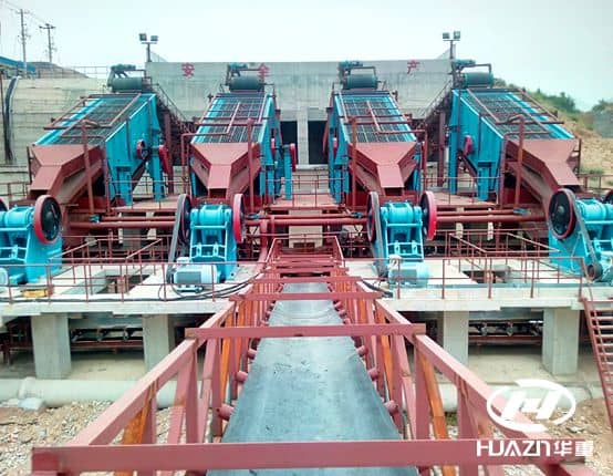 該系統(tǒng)位于陜西境內(nèi),系統(tǒng)以生產(chǎn)建筑用砂石骨料為主,系統(tǒng)設(shè)計(jì)規(guī)模為1200t/h。該系統(tǒng)由我公司實(shí)施工藝流程設(shè)計(jì),主要設(shè)備制造,基礎(chǔ)施工設(shè)計(jì),系統(tǒng)指導(dǎo)安裝,調(diào)試培訓(xùn),交付運(yùn)行。破碎物料為開挖天然礫石料,且泥土含量較高,為了提高成品粒度的品質(zhì)、潔凈程度,該系統(tǒng)設(shè)計(jì)時,著重考慮了系統(tǒng)的篩分、水洗、脫泥工藝,設(shè)備配置為2YKRH2460重型篩4臺,ASD3625顎式破碎機(jī)4臺,HPY300圓錐破碎機(jī)4臺、3YKRH2473重型篩4臺,2XL1118洗石機(jī)2臺,DXS3.6斗輪洗砂機(jī)4臺,SH800細(xì)砂回收4臺等。