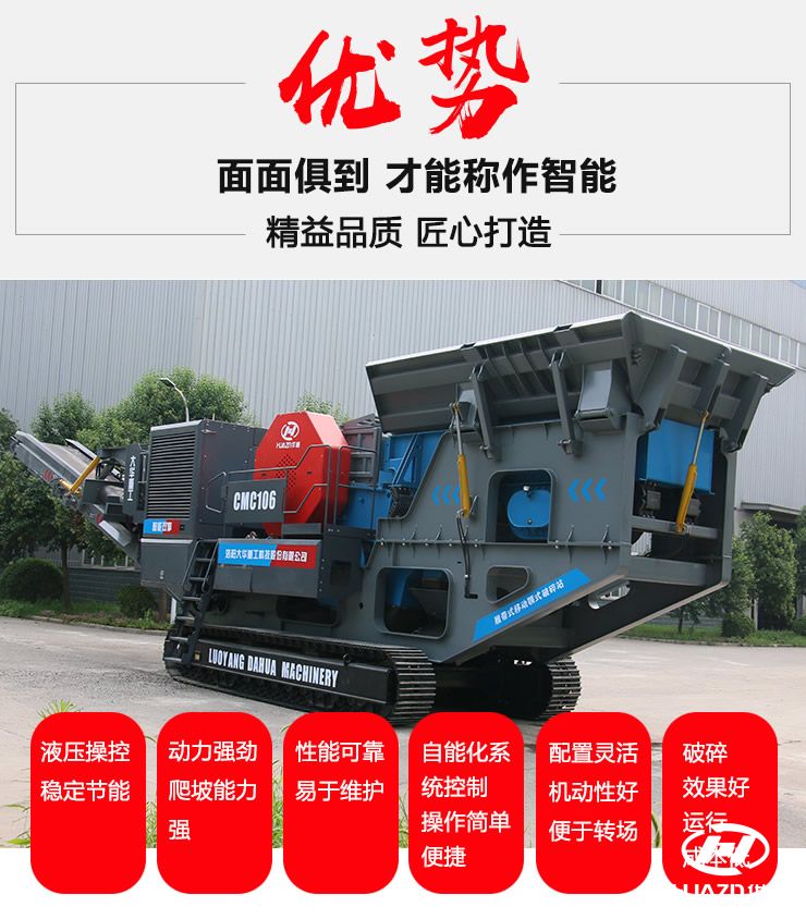 移動式破碎機適用性廣泛,它的核心破碎設備可分為顎式破碎機、反擊式破碎機、圓錐破碎機或沖擊式破碎機,再加上振動篩、給料機,輸送機等輔助設備,一臺機器就相當于一條破碎生產(chǎn)線,整車配置靈活,搭配方式多種多樣,可以滿足不同用戶的生產(chǎn)需要。下面小編給大家推薦洛陽大華重型機械的履帶式移動破碎站。