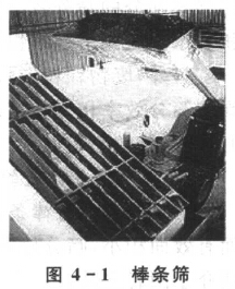 棒條篩(GrizZly screen)由一組具有一定斷面形狀的棒條所組成。如圖4—1所示,這些捧條平行安放,棒條與棒條之間的間隙即篩孔尺寸。棒條篩安裝傾角應大于廢物對篩面的摩擦角,一般為30°一35°,以保證廢物沿篩面下滑。棒條篩篩面的篩孔尺寸為要求篩下產品粒度的1.1—1.2倍,一般篩孔尺寸不小于50 mm。物料從棒條一端給入,并順棒條方向運動,細粒穿過縫隙成為篩下物,粗粒從端面的末端排出。