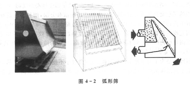 弧形篩(圖4—2)篩面呈弧形,待篩分物料制成料漿。料漿含水約為30%。 從弧形篩頂部結入。在篩面上,由于料漿受重力、離心力及篩條對料漿的阻力作 用,使料漿緊貼篩面流動。緊貼篩面的下層料漿運動速度低,細粒和液體從篩縫 中落入篩下,大顆粒從篩面末端排出。一般通過篩縫的顆粒尺寸為篩縫寬度的 1/4,所以這種篩不易發(fā)生堵塞,但篩分效率低。