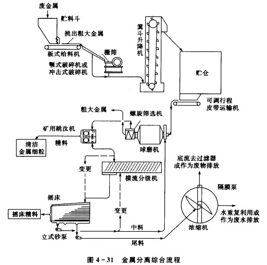 幾乎沒有一個廢物資源回收廠能備置得起一整套分離和回收利用各種金屬 的系統(tǒng),因此,這些廢物一般都賣給其他處理廠。然而,通過選擇性地回收一種 或幾種有經(jīng)濟效益的金屬是可以實現(xiàn)的.如圖4—30所示。