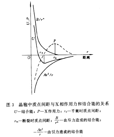 當(dāng)晶體受到外力而被壓縮時(shí),r<r0,這時(shí)斥力增大超過(guò)引力的增大,剩余的斥力支撐著外力的壓迫。當(dāng)晶體受外力作用而伸張時(shí),r<r0引力的減小少于斥力的減小,多余的引力抗御著外力的拆散作用。但隨著質(zhì)點(diǎn)間距的進(jìn)一步增加,引力的絕對(duì)值是減小的,故伸張到一定程度,當(dāng)r =rm 之后(見(jiàn)圖3),質(zhì)點(diǎn)間互作用力P不可能再增大了,晶體終于抵制不住外力的拉伸而被破碎。即是說(shuō),施于晶體上的外力若超過(guò)了最大可能的互作用力,晶體就被肢解了。