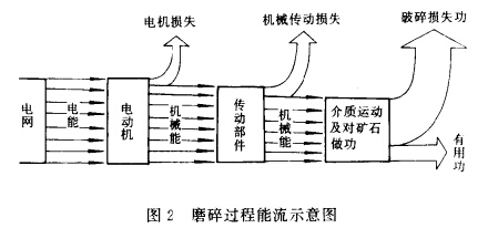 如圖2所示,磨礦過(guò)程中有三次大的能量損失。第一次能量損失是電動(dòng)機(jī)將電能轉(zhuǎn)變?yōu)闄C(jī)械能時(shí)產(chǎn)生的。該損失的大小取決于電動(dòng)機(jī)的效率,按目前電動(dòng)機(jī)的制造水平,效率一般為90%-95%,電動(dòng)機(jī)損失約占總能耗的5%-10%,這部分損失較小,也難于降低,此環(huán)節(jié)上節(jié)能潛力不大。第二次能量損失是從電動(dòng)機(jī)輸出的機(jī)械能經(jīng)傳動(dòng)系統(tǒng)而轉(zhuǎn)變?yōu)槟サV介質(zhì)的機(jī)械能時(shí)產(chǎn)生的。該損失大小取決于傳動(dòng)效率高低。按目前的機(jī)械制造水平,這部分損失通常占總能耗的10%-15%。多年來(lái)曾搞過(guò)以滾柱軸承代替滑動(dòng)軸承、采用液力靜壓軸承和采用環(huán)形馬達(dá)直接傳動(dòng)等辦法,但此部分能量損失比例不大,節(jié)能的效果有限,節(jié)能潛力也不大。第三次能量損失是介質(zhì)的機(jī)械能轉(zhuǎn)變?yōu)榈V石的表面能時(shí)