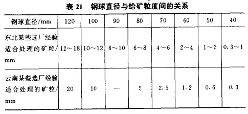 許多選礦廠出于省事,而且對(duì)鋼球尺寸在粗磨礦中所起的作用認(rèn)識(shí)不足,磨機(jī)裝球直接參照一些書(shū)中所列出的經(jīng)驗(yàn)球徑(表21所示)。表中的球徑值與表19所列的國(guó)外選礦廠粗磨球徑相比,這些經(jīng)驗(yàn)球徑明顯是偏大的。主要原因在于這些經(jīng)驗(yàn)球徑來(lái)源于五六十年代選廠磨礦實(shí)踐,而當(dāng)時(shí)的磨機(jī)直後均較小,只能以鋼球重量來(lái)彌補(bǔ)勢(shì)能的不足。而現(xiàn)在選廠多采用大直徑磨機(jī),所以直接采用經(jīng)驗(yàn)球徑誤差也是較大的。