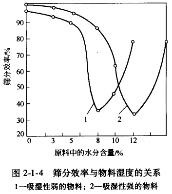 水分對某種物料的篩分過程的具體影響,只能根據(jù)試驗結(jié)果判斷。篩分效率與物料濕度的關(guān)系見圖2-1-4。圖中,兩種物料所受酌影響是不同的,產(chǎn)生差別的原因可以由這兩種物料具有不同的吸濕性能來解釋。