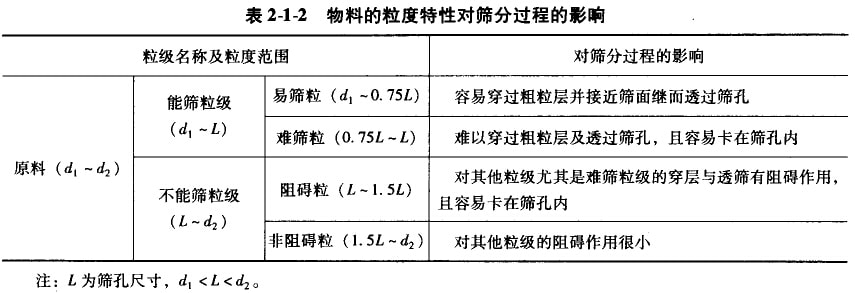 表2-1-2列出了物料的粒度特性對篩分過程的影響。