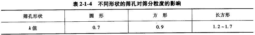 由表2-1-2中可知,原料中所含的難篩粒及阻礙粒相對其他粒級較多時,對篩分過程不利:而所含的易篩粒和非阻礙粒相對其他粒級較多時,對篩分過程有利。