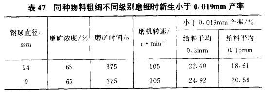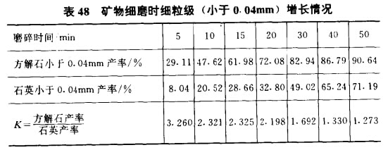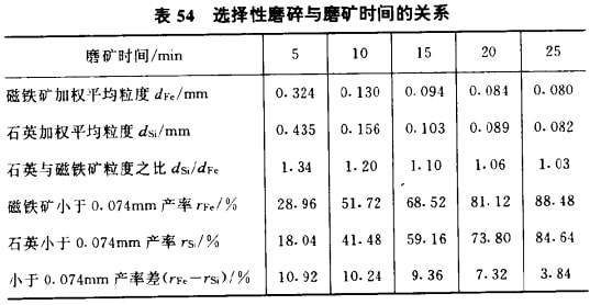 (8)隨粒度變細(xì),各種礦物的選擇性破碎現(xiàn)象減弱。隨顆粒粒度的變細(xì),礦物強(qiáng)度增加,軟硬礦物的磨碎速度開始趨于一致, 表48的數(shù)據(jù)已說明此點,K值隨磨礦時間的延長逐漸趨向于1。 表54所示為選擇性磨碎現(xiàn)象與磨碎時間的關(guān)系。結(jié)果說明:隨磨礦時間的延長,礦物顆粒變細(xì),軟硬兩種礦物的平均粒度差變小,磨碎時間足夠長時,二者粒度可達(dá)到相同;軟硬兩種礦物小于0. 074mm產(chǎn)率差隨磨礦時間的延長而減少,而且時間愈長產(chǎn)率差值愈小,即粗磨下選擇性磨碎現(xiàn)象顯著,而細(xì)磨下選擇性磨碎現(xiàn)象逐漸減弱。造成這一現(xiàn)象的原因是礦物隨粒度減小強(qiáng)度增大,礦物之間強(qiáng)度差縮小,選擇性磨碎現(xiàn)象減弱。
