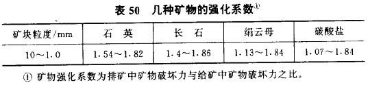 (4)礦石細(xì)磨下存在抗磨性逐漸增強(qiáng)的趨勢。由于存在選擇 性磨碎現(xiàn)象,力學(xué)性質(zhì)不均勻的礦石在細(xì)磨過程中強(qiáng)度小的被磨細(xì),強(qiáng)度大的則殘留下來。由此引起磨機(jī)排礦中某一粒級的強(qiáng)度比給礦中同一粒級的大,即礦石被磨礦后被強(qiáng)化,這種現(xiàn)象從表49及表50列舉的自磨機(jī)測定結(jié)杲可以證實。加拿大湖岸選廠的 試驗也可以證明此點。湖岸選廠用不同粒級的礦砂進(jìn)行細(xì)磨,在相同條件下各磨20min,結(jié)果證明愈細(xì)級別的礦砂抗磨性愈大,愈難磨細(xì),殘留粒級量愈多。因為給入細(xì)磨的物料均是經(jīng)前面多次破碎及粗磨過的產(chǎn)物,也均是一些殘留下來強(qiáng)度好的礦粒,所以 磨細(xì)它們相當(dāng)困難。