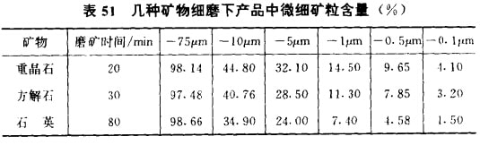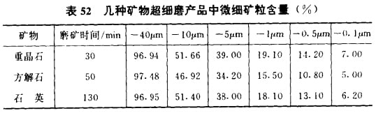 (6)礦石細(xì)磨下微細(xì)礦粒布朗運動影響顯著增強(qiáng)。用重晶石、 方解石、石英等三神礦物作細(xì)磨及超細(xì)磨試驗,結(jié)果發(fā)現(xiàn),細(xì)磨 下小于lμm的含量約7%~15%,超細(xì)磨下小于1μm的含量則高達(dá)15%~20%,見表51及表52所示。雖然膠體分散體系是指分散相大小在lμm到lnm之間的分散體系,但這樣的劃分范圍,并不是固定不變的。膠體分散體系具有明顯的布朗運動現(xiàn)象,但有資料指出,粒度稍大于的顆粒的布朗運動位移量已大于重力作用的位移量,情況如表53所示。細(xì)磨或超細(xì)磨下,粒度在以下的礦粒已達(dá)20%,即有1/5的礦粒接近布朗運動狀態(tài), 所以在研究細(xì)磨時就不能不考慮這種現(xiàn)象。