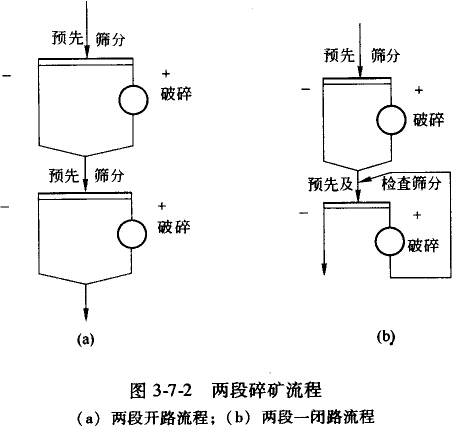 采用兩段破碎流程的多是小型選礦廠,因為從采礦來的原礦粒度較小之故,也有的由于有工藝的特殊要求而采用兩段破碎流程。