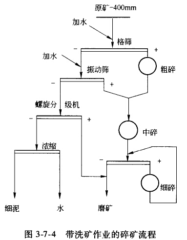 由于原礦性質的不同,洗礦的方式和細泥的處理等不同,因而流程多樣,現列舉例。原礦為矽卡巖型銅礦床,含泥6%-11%,含水8%左右,其洗礦流程如圖3-7-4所示,破碎流程為三段一閉路:為使破碎機能安全、正常地生產,第一次洗礦在格篩上進行,篩上產物進行粗碎,篩下產物進入振動篩再洗。第二次洗礦后的篩上產物進入中碎,篩下產物進螺旋分級機分級、脫泥,分級返砂與最終破碎產物合并,分級溢流經濃密機緩沖,脫水后,進行單獨的細泥磨礦、浮選。