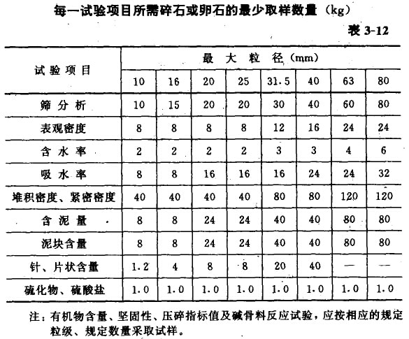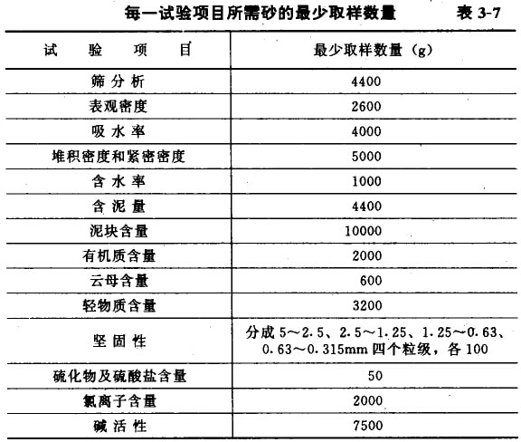 每一單項(xiàng)試驗(yàn)的試樣應(yīng)不少于表3—7所規(guī)定的最少取樣數(shù)量。需作幾項(xiàng)試驗(yàn)時(shí),如確能保證試樣經(jīng)一項(xiàng)試驗(yàn)后不致影響另一項(xiàng)試驗(yàn)的結(jié)果,可用同一試樣進(jìn)行幾項(xiàng)不同的試驗(yàn)。