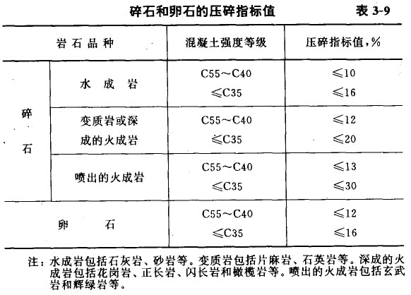 碎石或卵石須具有足夠的強(qiáng)度,以保證混凝土的強(qiáng)度要求。碎石的強(qiáng)度可用巖石的抗壓強(qiáng)度和壓碎指標(biāo)值表示。巖石的抗壓強(qiáng)度與混凝土強(qiáng)度等級(jí)之比不應(yīng)小于1.5,且火成巖強(qiáng)度不宜低于80MPa,變質(zhì)巖不宜低于60MPa,水成巖不宜低于30MPa;炷翉(qiáng)度等級(jí)為C60及C60以上時(shí)應(yīng)進(jìn)行巖石抗壓強(qiáng)度檢驗(yàn),其他情況下如有懷疑或認(rèn)為有必要時(shí),也可進(jìn)行抗壓強(qiáng)度試驗(yàn)。巖石的抗壓強(qiáng)度首先應(yīng)由碎石生產(chǎn)供應(yīng)單位提供檢驗(yàn)報(bào)告。工程中經(jīng)常性的質(zhì)量控制,可用壓碎指標(biāo)值檢驗(yàn)控制碎石的強(qiáng)度,碎石的壓碎指標(biāo)值宜符合表3-9的規(guī)定。
