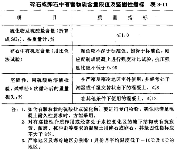 碎石或卵石的堅(jiān)固性,硫化物和硫酸鹽含量以及卵石中有機(jī)雜質(zhì)含量應(yīng)符合表3-11的規(guī)定。