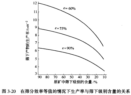 被篩物料的粒度組成,對于篩分過程有決定性的影響,在任何情況下,細(xì)?偸潜却至H菀淄ㄟ^篩孔。因此,當(dāng)物料中細(xì)級別含量增大時,篩子的生產(chǎn)率也隨之顯著增大。圖3-20所示曲線表示不同篩分效率時的生產(chǎn)率(按篩下產(chǎn)物計算)與原料中細(xì)粒級含量之間的關(guān)系。由圖可以看出,當(dāng)原物料中篩下級別的含量由10%增加到90%時,篩子的生產(chǎn)率幾乎增大一倍。這是因為,當(dāng)篩下級別含量大的物料給入篩面時,細(xì)粒很迅速地通過篩孔,而留在篩上的物料就很少了, 此時,即使在篩上物料中還有一些"難篩粒",相對地比較容易通過篩孔,因為其他礦粒對它們的影響小。反之,當(dāng)原物料中篩下級別含量少時,因為整個篩面幾乎被篩上產(chǎn)物所占據(jù),妨礙了細(xì)粒通過篩孔,因此,在保證篩分效率相等的條件下,按給礦量計算的生產(chǎn)率也就降低了;所以當(dāng)原物料中細(xì)級別含量少,而粗級別的粒度又比篩孔尺寸大得多的時候,為了提高篩子的生產(chǎn)能力和延長篩網(wǎng)的使用壽命,可以采用增加輔助篩網(wǎng)的方法,用篩孔尺寸較大的輔助篩網(wǎng),預(yù)先篩除篩上產(chǎn)物過粗的級別,然后用下層篩網(wǎng)對含有大量細(xì)級別的物料進(jìn)行最終篩分,此時,雙層篩作單 層篩使用,只接兩個產(chǎn)品。
