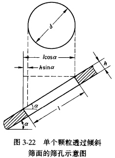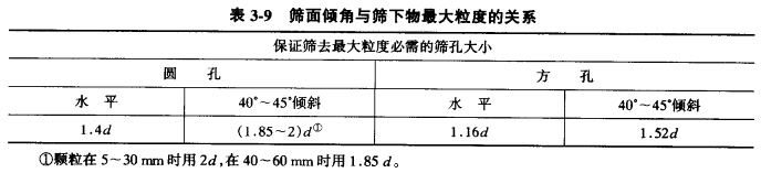 一般情況下,篩子是傾斜安裝的,以便于排出篩上物料。傾角大小要合適,傾角過小,物料在篩面上運(yùn)動速度太慢,雖然篩分效率高,但篩子的生產(chǎn)率減;反之,傾角太大,物料排出太快,篩分效率降低。當(dāng)篩面傾斜安裝時,可以讓顆粒順利通過的篩孔尺寸只相當(dāng)于篩孔的水平投影,如圖3-22所示。能夠無阻礙地透過篩孔的顆粒直徑等于d = Icosa - hsina,式中I為篩孔尺寸,h為篩面厚度,a為篩子的傾角。由此可見,篩面的傾角愈大, 使顆粒通過時受到的阻礙愈大。因此,篩面的傾角要適當(dāng)。表3-9所示為篩面的傾角與篩下物最大粒度及篩孔尺寸的關(guān)系。
