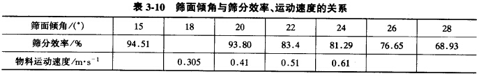 篩面傾角的大小直接影響物料在篩面上的運(yùn)動速度和篩分效率,如表3-10所示。由此可見,隨著振動篩安裝傾角的增大,篩面上物料的運(yùn)動速度明顯加快,同時,篩分效率下降。