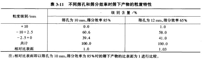 例如用短頭圓錐破碎機和振動篩構(gòu)成閉路破碎中硬礦石時,要求破碎最終產(chǎn)物粒度為10 mm,檢查篩分的篩孔尺寸應(yīng)為10 mm,此時的篩分效率為85%;但是,也可以采用篩孔尺寸為12 mm,而將篩分效率降低至65% (通過改變篩面傾角或增加給礦量),采用上述兩種篩分工作制度,所得到的篩下產(chǎn)品有著相同的比表面積(單位質(zhì)量的表面積m2/t),即篩下產(chǎn)品有相同的平均粒度。見表3-11。也就是說,篩下產(chǎn)物的質(zhì)最是相等的。