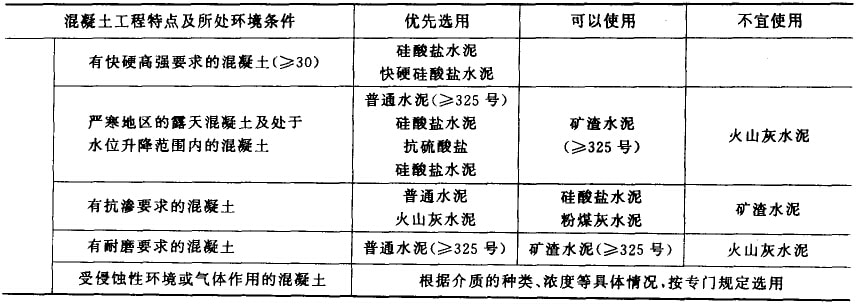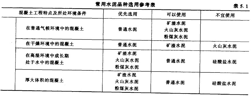 配制混凝土用的水泥,應從工程性質及所處的環(huán)境,結合水泥特性綜合考慮。常用水泥品種選用見表5.1。