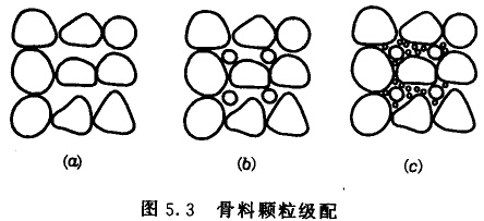 砂的顆粒級配是指不同大小顆粒的砂子組合情況。一般粗細均勻的砂粒,其孔隙率較大,但如果各種粒徑的顆粒搭配恰當,使中等顆粒能填充粗顆粒的空隙,細顆粒又能填充中等顆粒的空隙,就可以使砂子得到較小的空隙率,如圖5.3所示。因此,砂子的空隙率取決于砂料各級粒徑的搭配,級配好的砂子不僅可以節(jié)約水泥,還可以提高混凝土的密實性及強度。