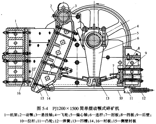 圖5-4是我國生產(chǎn)的PJ1200X 1500簡單擺動顎式破碎的剖視圖。這種碎礦機主要是由機架和支承裝置,碎礦的工作機構(gòu),傳動機構(gòu),保險裝置及排礦口調(diào)整裝置等幾部分組成。