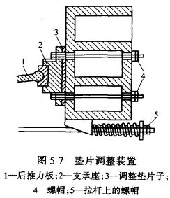 如圖5-7所示,在后推力板1的支承座2后面放人一組厚度相同的墊片3,改變墊片的數(shù)量,即可達到調(diào)整排礦口大小的目的。在調(diào)整排礦口 時,要先將螺帽4及拉桿彈簧螺帽5松開,然后增加或減少墊片的數(shù)目,待排礦口調(diào)整好后,再將螺帽4上緊,并調(diào)整彈簧上的螺帽5。用此法可以達到多級調(diào)整,調(diào)整 時也比較方便,同時可以使機器結(jié)構(gòu)緊湊和質(zhì)量減小。 但調(diào)整時必須停車。這種方法常用在大、中型碎礦機上。