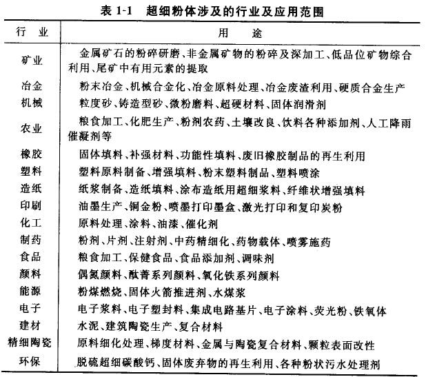 超細(xì)粉體工業(yè)是多學(xué)科的組合,超細(xì)粉體幾乎應(yīng)用于國民經(jīng)濟的所有部門,表l-l為超細(xì)粉體涉及的行業(yè)及應(yīng)用范圍。