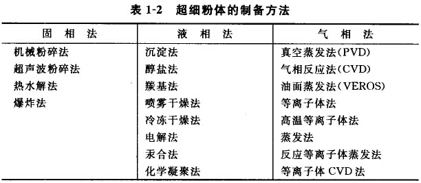 因為超細(xì)粉體具有優(yōu)良的性能和廣泛的用途,所以人們研制了許多的制備方法。主要制備方法見表1-2。