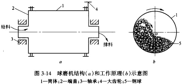 圓筒形球磨機(jī)在細(xì)磨中應(yīng)用員為廣泛,圖3-14所示為球磨機(jī)的結(jié)構(gòu)和工作原理。主要由圓柱筒體、端蓋、中空軸頸、軸承和傳動(dòng)大齒圈等部件組成。筒體內(nèi)裝有直徑為25-150mm鋼球,其裝入且是整個(gè)筒體有效容積的25%-50%。筒體內(nèi)壁設(shè)有襯板,除防止筒體磨損外,兼有提升鋼球的作用,筒體兩端的中空軸頸有兩個(gè)作用:一是起軸頸的支撐作用,使球磨機(jī)全部重量經(jīng)中空袖頸傳給軸承和機(jī)座;二是起給料和排料的漏斗作用。電動(dòng)機(jī)通過(guò)聯(lián)軸器和小齒輪帶動(dòng)大齒圈和筒體以一定轉(zhuǎn)速轉(zhuǎn)動(dòng)。
