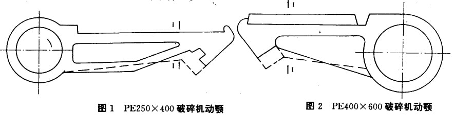 據(jù)統(tǒng)計國內(nèi)大約100余家生產(chǎn)顎式破碎機的廠家,有些還是采用50年代從蘇聯(lián)引進的技術(shù)生產(chǎn)破碎機。有的破碎機動顎結(jié)構(gòu)不盡合理,使動顎沉重而強度又較低,從而降低其使用壽命,浪費原材料,例如PE250×400PE400×600顎式破碎機動顎結(jié)構(gòu)(圖1、2)均不合理。