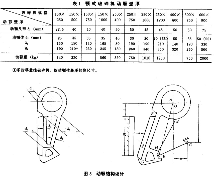 動顎體的壁厚可根據(jù)強度計算并考慮剛度來選定。還可參考實際數(shù)據(jù)(表1)選定。