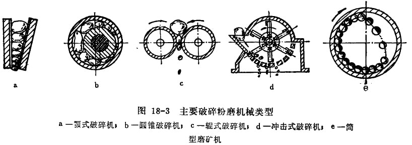 選礦廣所使用的粉碎機(jī)械可歸納為破碎機(jī)械和磨礦(粉磨)機(jī)械兩大組;而破碎機(jī)按給礦和產(chǎn)品的粒度大小又可分為粗碎、中碎和細(xì)碎破碎機(jī)。常用的粉碎機(jī)械按其粉碎方法、工作原理和結(jié)構(gòu)特征,基本上可分成以下幾種類型。