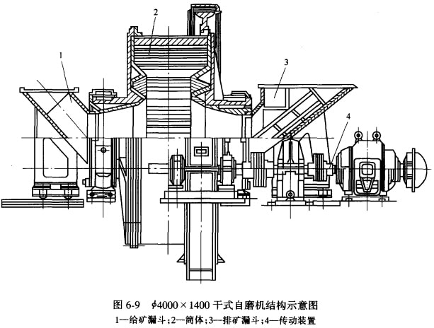 干式自磨機(jī)如圖6-9所示。主要由給礦漏斗、筒體、排礦漏斗及傳動裝置、潤滑裝置等組成。 干式自磨機(jī)與球磨機(jī)比較其結(jié)構(gòu)特點(diǎn)如下: