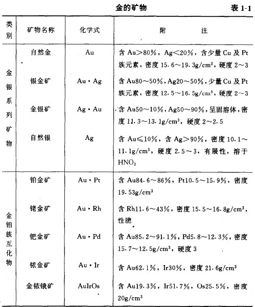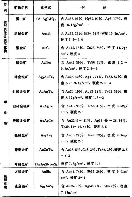 目前在自然界中已發(fā)現(xiàn)的金礦物有98種,何常見(jiàn)的只有47種,而工業(yè)礦物僅有十多種。最主要的是自然金、銀金礦和金銀礦具有工業(yè) 意義,其次是金的碲化物,例如碲金礦、蹄金銀礦,雖然種類較多,分布較廣,但數(shù)量不多,經(jīng)濟(jì)價(jià)值不大。已發(fā)現(xiàn)的金礦物列產(chǎn)表1-1 。