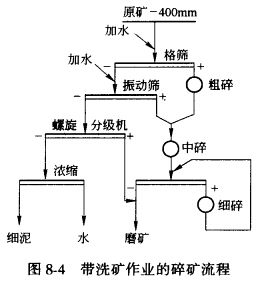 因原礦性質(zhì)不同,洗礦方式及對細(xì)泥的處理方法不同,所以流程也是多種多樣的,如圖8-4所示。原礦為矽卡巖型銅礦床,含泥為6%~8%,含水在8%左右,其碎礦流程為三段一閉路。為了碎礦機(jī)能安全正常的工作,第一次洗礦在格篩上進(jìn)行,篩上產(chǎn)物進(jìn)行粗碎,篩下產(chǎn)物進(jìn)入振動篩加水沖洗,振動篩的篩上產(chǎn)物進(jìn)人中碎,中碎后進(jìn)入第三段閉路碎礦。 振動篩的篩下產(chǎn)物進(jìn)入螺旋分級機(jī)分級脫泥,分級返砂與最終碎礦產(chǎn)物合并進(jìn)入下一段磨礦。 分級溢流進(jìn)入濃縮機(jī)、緩沖及脫水后,單獨進(jìn)行礦泥的磨礦和選別。
