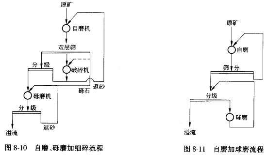 一段自磨流程如圖8—8所示,可分為一段全自磨和一段半自磨兩種。