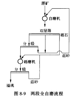 當(dāng)要求磨礦細(xì)度超過(guò)70%—200目時(shí),應(yīng)采用兩段白磨流程。兩段自磨也可分為兩段全自磨和兩段半自磨兩種流程,下面分別介紹。