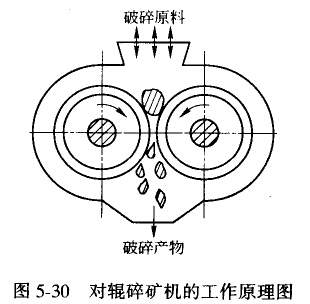 對(duì)輥破碎機(jī)的工作原理如圖5-30所示。物料從上面加入破碎機(jī),兩個(gè)圓輥相向旋轉(zhuǎn),由于物料與輥面的摩擦力將物料卷入破碎腔小,被輥?zhàn)铀鶋核。已破碎的礦石,在重力作用下,從兩個(gè)輥?zhàn)娱g的間隙處排出。