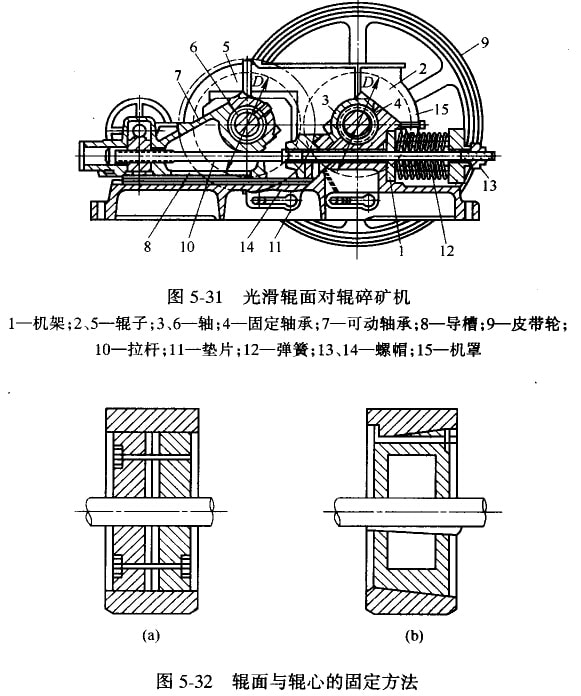 對(duì)輥碎礦機(jī)的構(gòu)造如圖5-31所示;對(duì)輥碎礦機(jī)的一個(gè)輥?zhàn)?安裝在軸3上,軸3在固定于機(jī)架1上的軸承4中旋轉(zhuǎn),另一個(gè)破碎輥5(稱(chēng)可動(dòng)輥)則安裝在袖6上,軸6在可以滑動(dòng)的軸承7中旋轉(zhuǎn)。軸承7是由拉桿10,墊片H、彈簧1Z、螺帽14和夾緊螺帽13固定在導(dǎo)槽8上。軸3和6的旋轉(zhuǎn),可以分別用兩個(gè)電機(jī)帶動(dòng),也可用一個(gè)電機(jī)通過(guò)天軸傳動(dòng)使兩個(gè)軸旋轉(zhuǎn),或采用專(zhuān)門(mén)的長(zhǎng)齒齒輪帶動(dòng)兩個(gè)袖旋轉(zhuǎn)。皮帶輪9又起褐輪的作用。