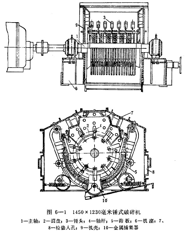 破碎機(jī)由機(jī)殼、轉(zhuǎn)子、調(diào)整裝置及電動(dòng)機(jī)等部分組成(圖6-1)。