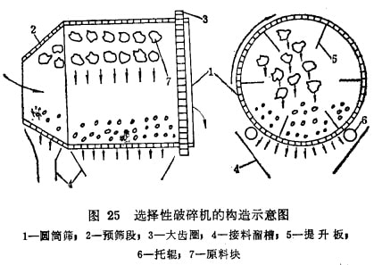 當(dāng)原煤中的凈煤和矸石的硬度有一定差異時,往往采用選擇 性破碎機進行處理。這種選擇性破碎機又簡稱選碎機,因機身主體的形狀是用篩板做成的圓筒,內(nèi)裝提升板,工作時轉(zhuǎn)動,故也 叫滾筒式破篩機(見圖25所示)。選碎機早在1904年已為選煤廠 所采用,日前在許多同家的選煤廠仍得到了普遍應(yīng)用。