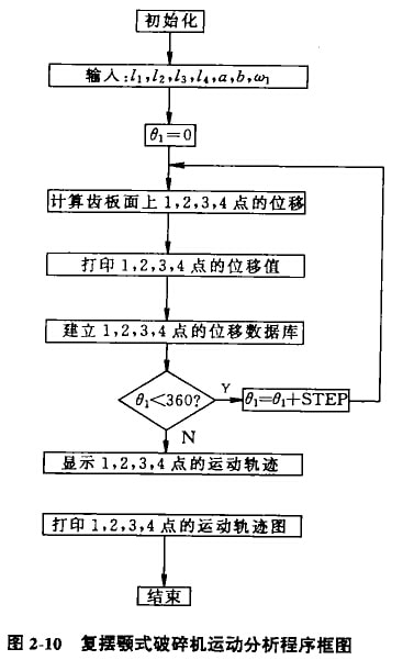 以600 x 900復(fù)擺領(lǐng)式破碎機(jī)為例進(jìn)行計(jì)算機(jī)輔助分析。已知:l1=0.019m,l2=1.43m、l3=0.46m,l4=1.22m,w1=26.18s-1。為了簡(jiǎn)化計(jì)算而又能說明問題,在動(dòng)顎齒板面上任取四點(diǎn).每點(diǎn)對(duì)應(yīng)的ai值分別為0.35m,0.78m,1.10m和1.43m,對(duì)應(yīng)的bi,值分別為0.445m,0.44m,0.437m和0.435m。當(dāng)偏心軸轉(zhuǎn)一周,即θ1從O°變化到360°時(shí),由式(2-3)—式(2-5)和已知條件可計(jì)算出齒板面上1—4點(diǎn)的位移并繪出相應(yīng)點(diǎn)的運(yùn)動(dòng)軌跡圖,其程序框如圖2-10所示。點(diǎn)的運(yùn)動(dòng)軌跡圖中,箭頭所在位置是θ1等于0°時(shí)點(diǎn)的起始位置,箭頭所指方向是點(diǎn)運(yùn)動(dòng)的方向。