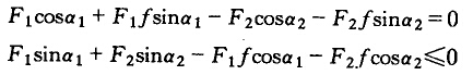以球心0為坐標(biāo)原點(diǎn),取直角坐標(biāo)系xoy,兩破碎襯板對(duì)物料施加的擠壓力為F1和F2,摩擦力為F1f和F2f。作用于物料上的力沿x軸和y軸方向的平衡方程式為