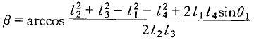 當(dāng)口角為銳角時(shí),肘板為下斜式;當(dāng)β角為鈍角時(shí),肘板為上斜式。肘板為廠斜式的復(fù)擺顎式破碎機(jī),通常傳動(dòng)角β=45°—55°,肘板為上斜式的復(fù)擺領(lǐng)式破碎機(jī),傳動(dòng)角β=105°。對(duì)于簡擺顎式破碎機(jī),當(dāng)曲柄偏心位置為最高點(diǎn),兩肘板的內(nèi)端點(diǎn)略低于兩外端點(diǎn)的連線,即β角近于90°。