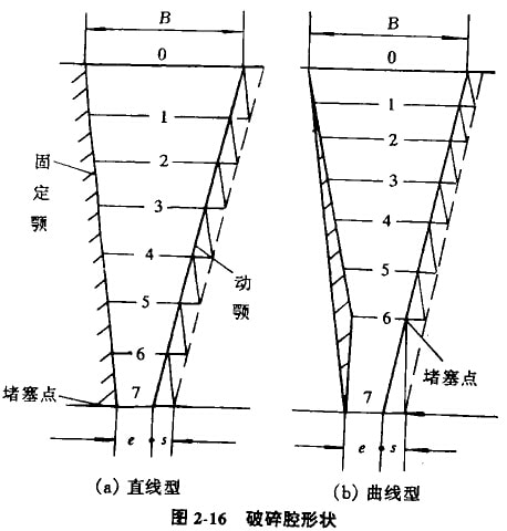 破碎腔形狀設(shè)計(jì)的是否合理,直接影響破碎機(jī)的破碎效果、生產(chǎn)率、能雖消耗、襯板磨損棚破碎比等里要指標(biāo)。破碎腔形狀如圖2-16所示,有直線型破碎腔和曲線型破碎腔。實(shí)踐與理論分析說明曲線型破碎腔優(yōu)于直線型破碎腔。因此,采用曲線型破碎腔是現(xiàn)代破碎設(shè)備結(jié)構(gòu)的發(fā)展方向。
