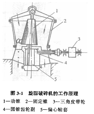 旋回破碎機的工作原理如圖3-1所示。動錐1與固定錐2之間形成的空間為破碎腔。電動機經(jīng)二角皮帶輪3和圓錐齒輪副4,使偏心鈉套5轉(zhuǎn)動,而偏心軸套5又帶動動錐1繞破碎機中心線作旋擺運動,當動镕靠近固定維時,給入破碎胺內(nèi)的物料受到擠壓和彎曲作用而被破碎,當動錐離開固定錐時,被破碎了的物料靠白重,從破碎腔底部排出。
