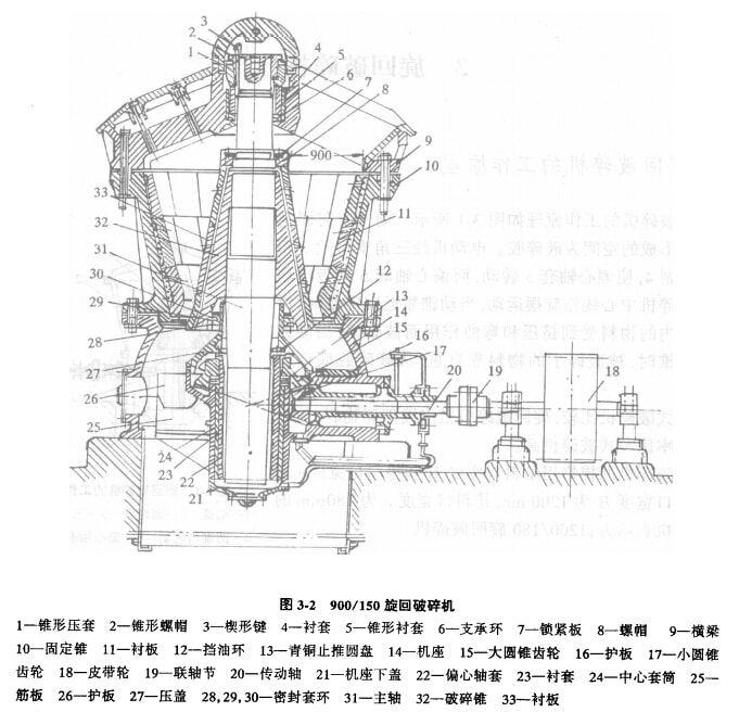破碎錐裝在主軸3l上。主軸的上端是通過錐形螺帽2、錐形壓套l、襯套4和支撐環(huán)6懸掛在橫梁9上。為了防止錐形螺帽松動,其L還裝有楔形鍵3。襯套4的錐形端支承在支撐環(huán)6上,而其側(cè)面則支承在內(nèi)表面為錐形的襯套5上。破碎機運轉(zhuǎn)時,由于襯套4的下端與錐形襯套5的內(nèi)表面部是圓錐面。故能保證襯套4沿支撐環(huán)6和錐形套5上滾動,從而滿足了破碎錐旋擺運動的要求。