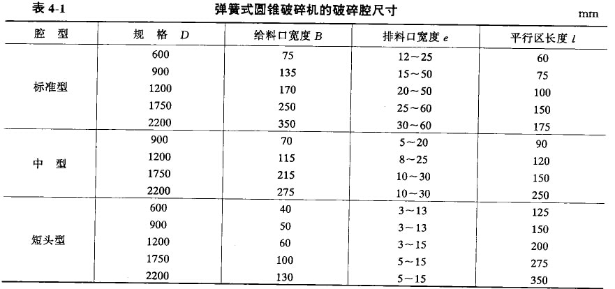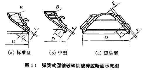 原來所用的標(biāo)記是用漢語拼音字母和動錐大頭直徑表示,如PYB2200,PYZ2200和PYc6200。其中,P為破碎機,Y為圓錐,B為標(biāo)準型,Z為中型,D為短頭型,2200為動錐大頭直徑(mm)。彈簧式圓錐破碎機的破碎腔斷面形狀,如圖4-1所示。其破碎腔尺寸見表4-1。